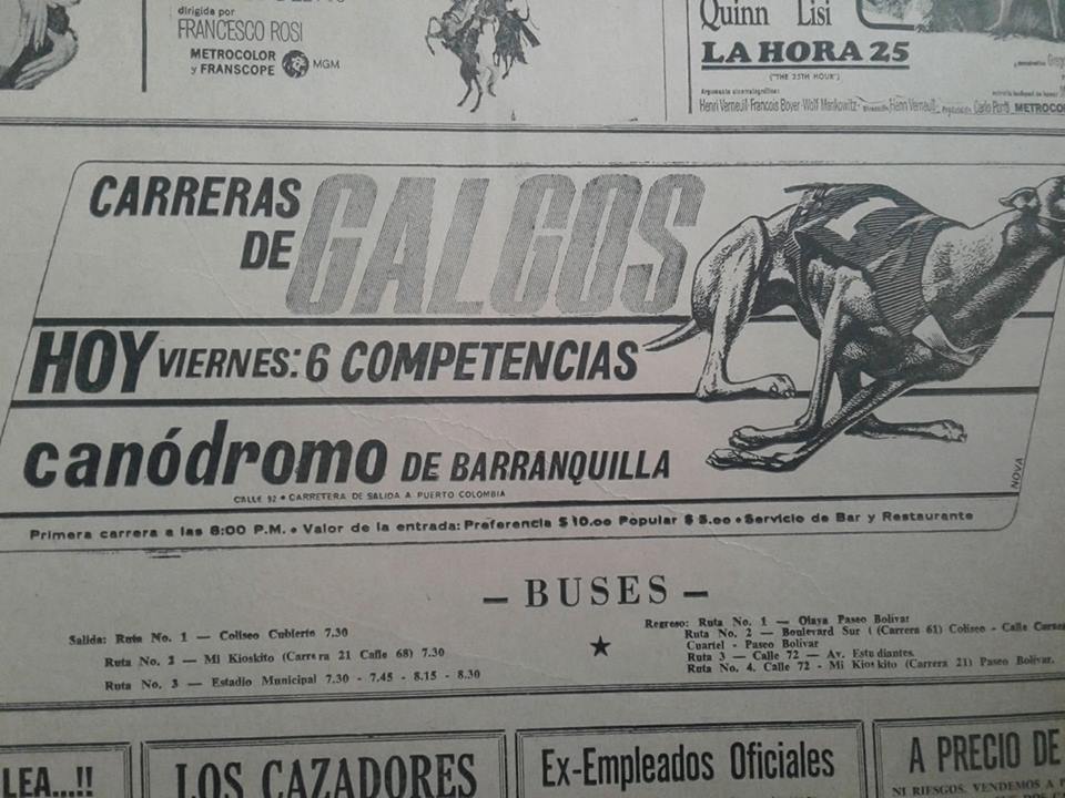 En 1966 se inicia en Barranquilla la construcción del canódromo, el primer y único estadio para el deporte canino o carrera de perros en la ciudad. La obra novedosa e innovadora se levantó en terrenos situados en la carrera 51B con calle 92, donde llegaban especies nacionales y del exterior con cuellos alargados y muy atléticos. Las entradas costaban entre 5 a 10 pesos, y los espectadores y apostadores escogían entre gradas popular o preferencial que incluía un bar donde tomaban y veían correr a los animales por el estadio persiguiendo una liebre eléctrica por las baranda de la pista. Aquí surge nace una historia de amor espeluznante y misteriosa denominada el perro negro.