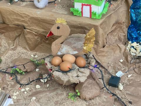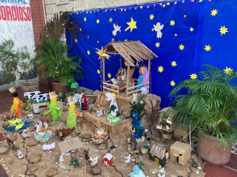 Para esta representación del nicho en el que nació el hijo de Dios, Narcy aseguró que usaron, entre otras muchas cosas, botellas de plástico, cartón de rollos de papel higiénico, hojas de palma seca y hasta cáscaras de huevo.