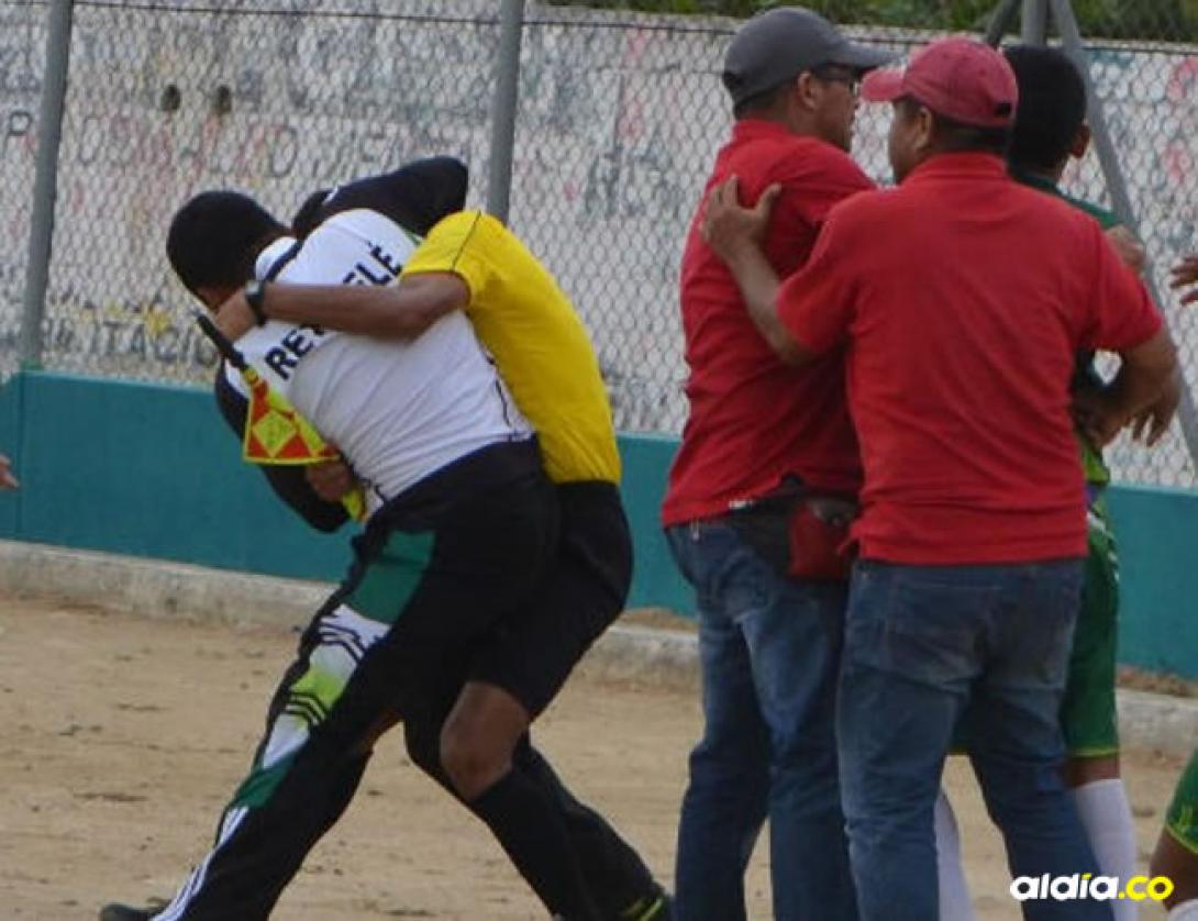 La reacción antideportiva del cuerpo técnico de Rey Pelé se generó la tarde del Sábado de Gloria tras una decisión arbitral que no le gustó a los entrenadores que terminaron agrediendo en el campo de juego a los jueces Moisés Arcia (central), Luis López y José González, (líneas).