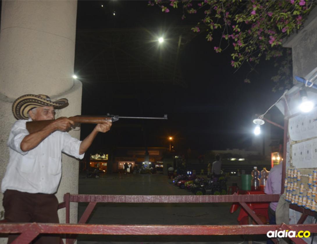 La carabina que usa actualmente la compró hace cuatro años y le costó 300 mil pesos. Ya le ha sacado el dinero porque la clientela que tiene es grande. La persona se acerca le compra un tiro, por el que le paga entre 500 y 1.000 pesos. A algunos les concede varios tiros por el mismo valor. La bala que usa es un clavo con el que dan al blanco. A cambio les obsequia una galleta dependiendo el puntaje que sume por las disparadas.