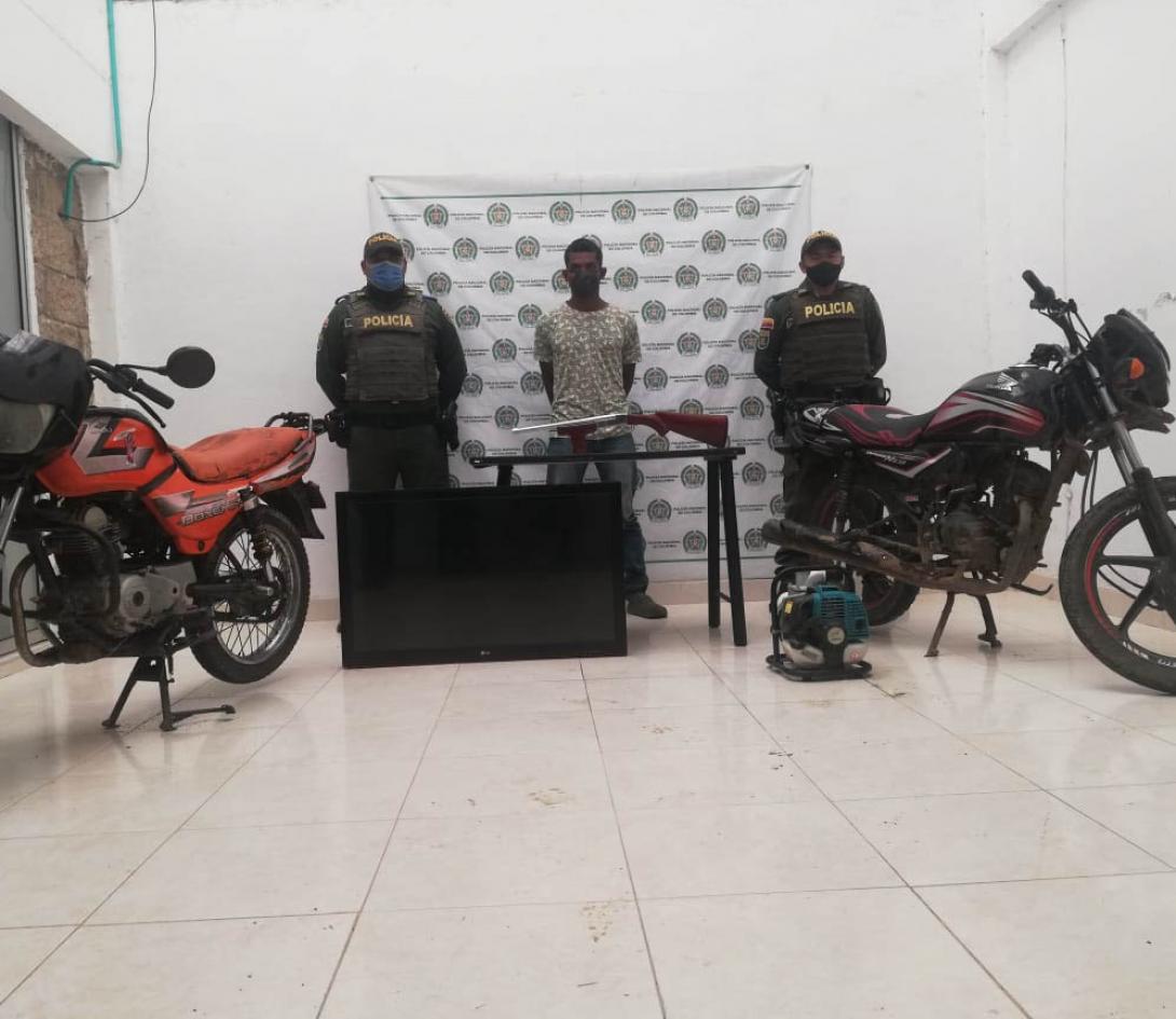 A Pérez le hallaron una escopeta artesanal sin números ni marca, así como un televisor LCD de 42 pulgadas y una motobomba. El presunto delincuente iba en una motocicleta que también fue incautada y en la que se presume llegaron los asaltantes a El Faro.