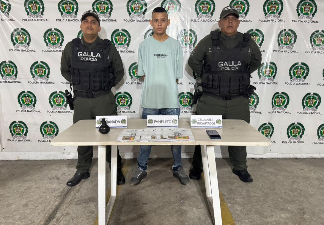 De acuerdo con el reporte oficial, durante el procedimiento las autoridades hallaron en poder del capturado panfletos extorsivos y una granada, elemento de uso privativo de las Fuerzas Armadas que también quedó incautado como material probatorio dentro de la investigación.