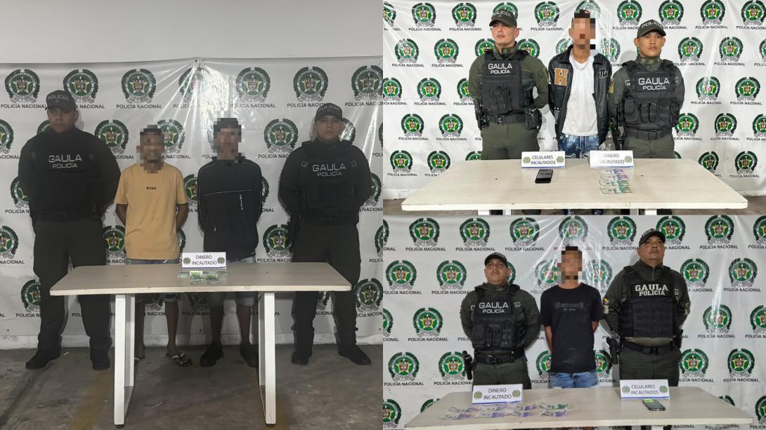 En un primer procedimiento, agentes del Gaula capturaron a un hombre señalado de cobrar extorsiones en el barrio Chiquinquirá. En el lugar también se confiscó un teléfono y unos 300.000 pesos que, según las autoridades, serían producto de exigencias económicas ilegales. En una segunda acción, otros dos sujetos fueron detenidos en el barrio Pasadena con 500.000 pesos que también estarían relacionados con pagos extorsivos.
