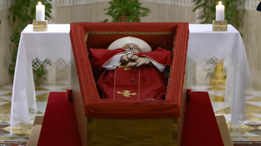 En las imágenes, el papa aparece con una mitra blanca sobre la cabeza y un rosario entre las manos, mientras yace sobre un féretro revestido de terciopelo rojo.