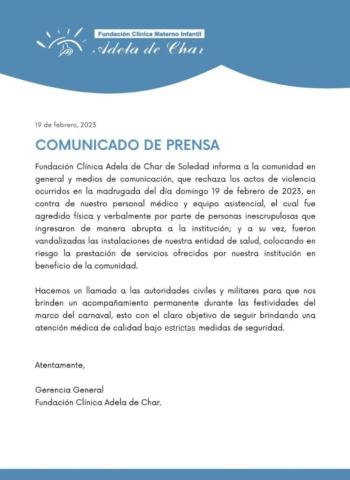 Por otro lado, dentro del mismo comunicado, la directiva de la clínica hizo un llamado a las autoridades civiles y militares “para que nos brinden un acompañamiento permanente durante la festividades del marco del Carnaval, esto con el claro objetivo de seguir brindando una atención médica de calidad bajo estrictas medidas de seguridad”.