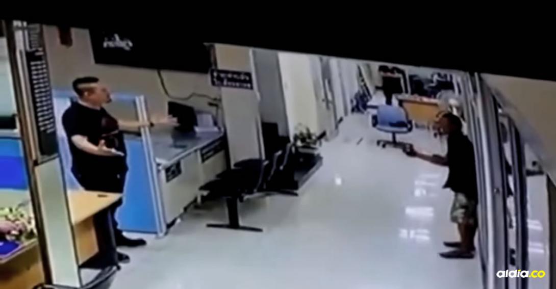 En las imágenes se puede ver a un hombre de 45 años que decide asaltar una comisaría. Armado con un arma blanca, ingresa al edificio y, según RCN Radio, pide a todos que les entreguen los objetos de valor.