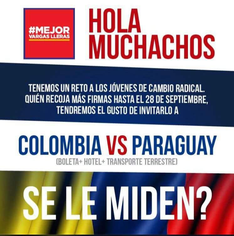 La polémica campaña en la que se invitaba a los jóvenes de Cambio Radical a recolectar firmas a favor del exvicepresidente Vargas Lleras, antes del 28 de septiembre para ganar una boleta para el partido de Colombia contra Paraguay, se canceló.
