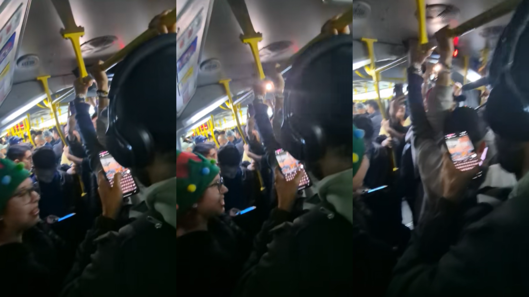 Un grupo de pasajeros dentro de un bus articulado del sistema TransMilenio en Bogotá transformó un viaje rutinario en un momento inesperado de tradición navideña, al iniciar una Novena de Aguinaldos mientras se trasladaban por la ciudad.